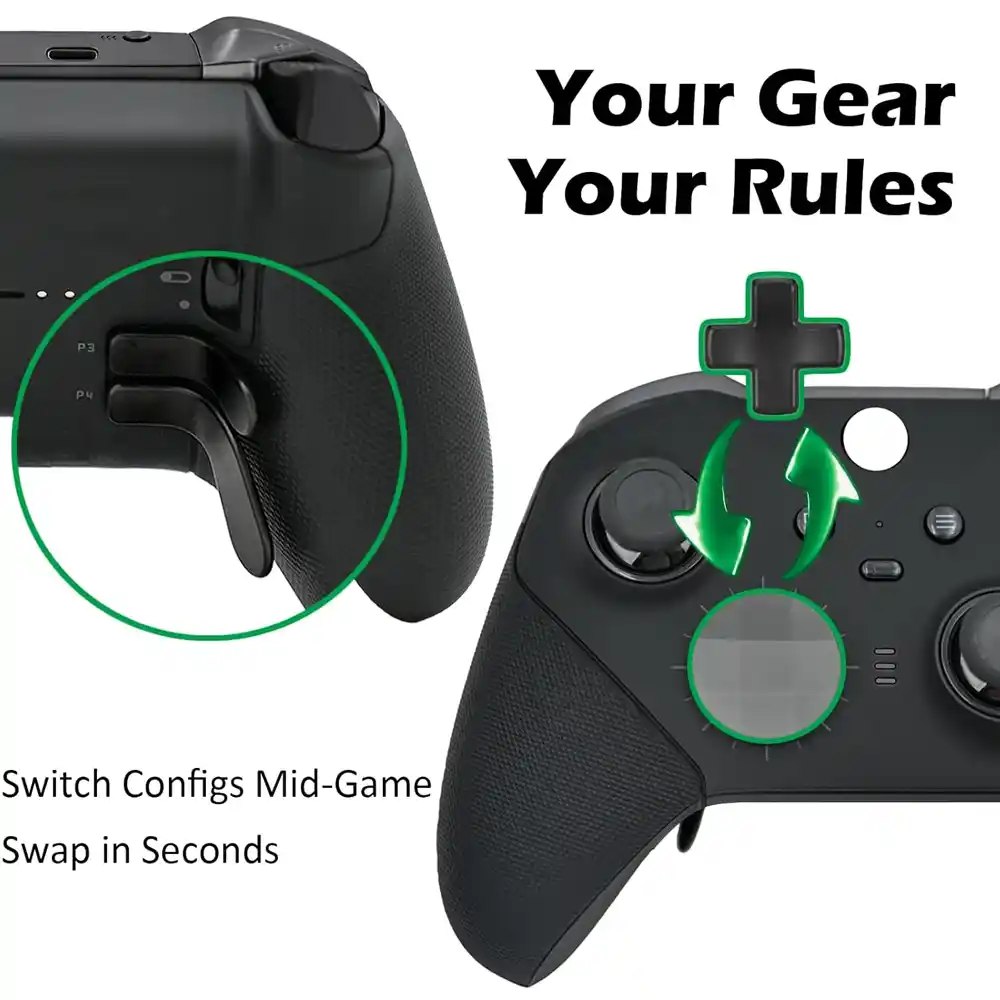 | Customization | Adjustable thumbsticks, interchangeable paddles, remappable buttons |